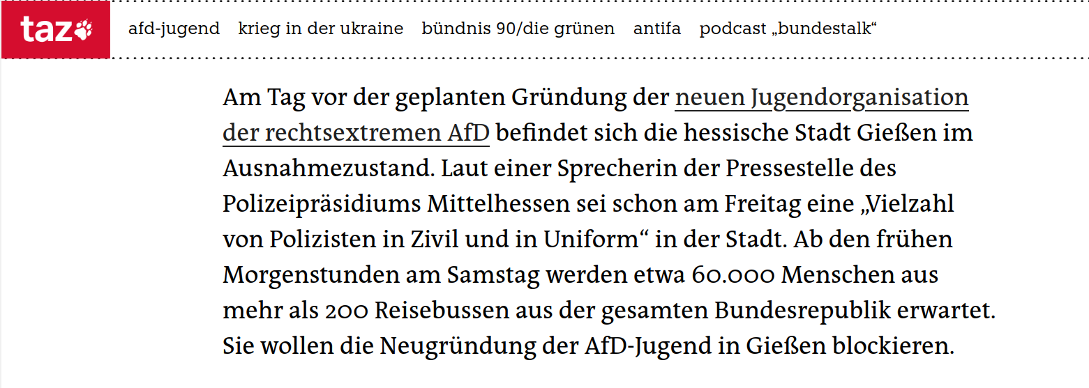 Die Tageszeitung taz aus Berlin schrieb am 28.11.25: „[...] Ab den frühen Morgenstunden am Samstag werden etwa 60.000 Menschen aus mehr als 200 Reisebussen aus der gesamten Bundesrepublik erwartet. Sie wollen die Neugründung der AfD-Jugend in Gießen blockieren. [...]“ Quelle: taz: Stadt im Ausnahmezustand, Abruf am 28.11.25.